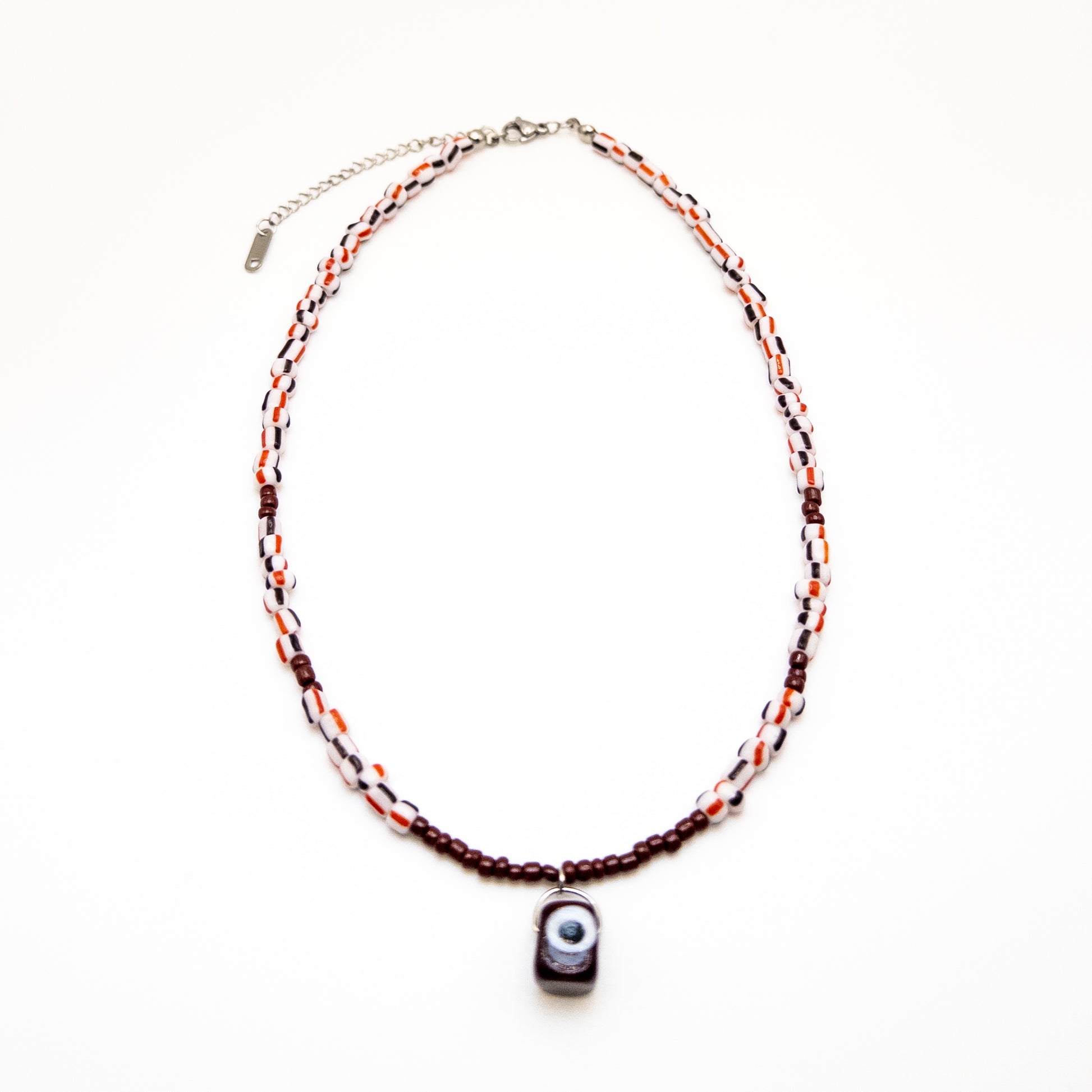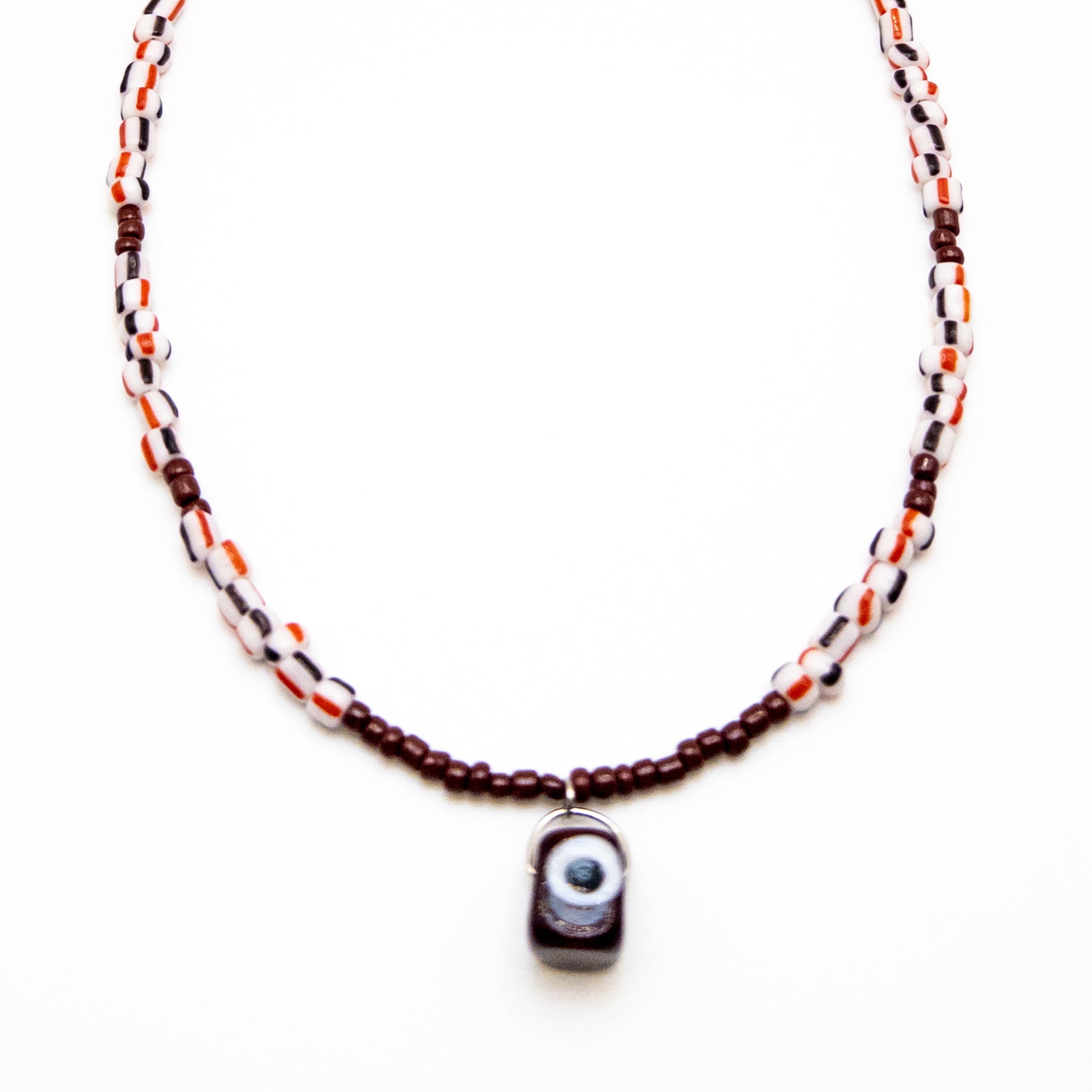 - Made of colourful striped beads and brown beads and also has a brown evil eye bead.