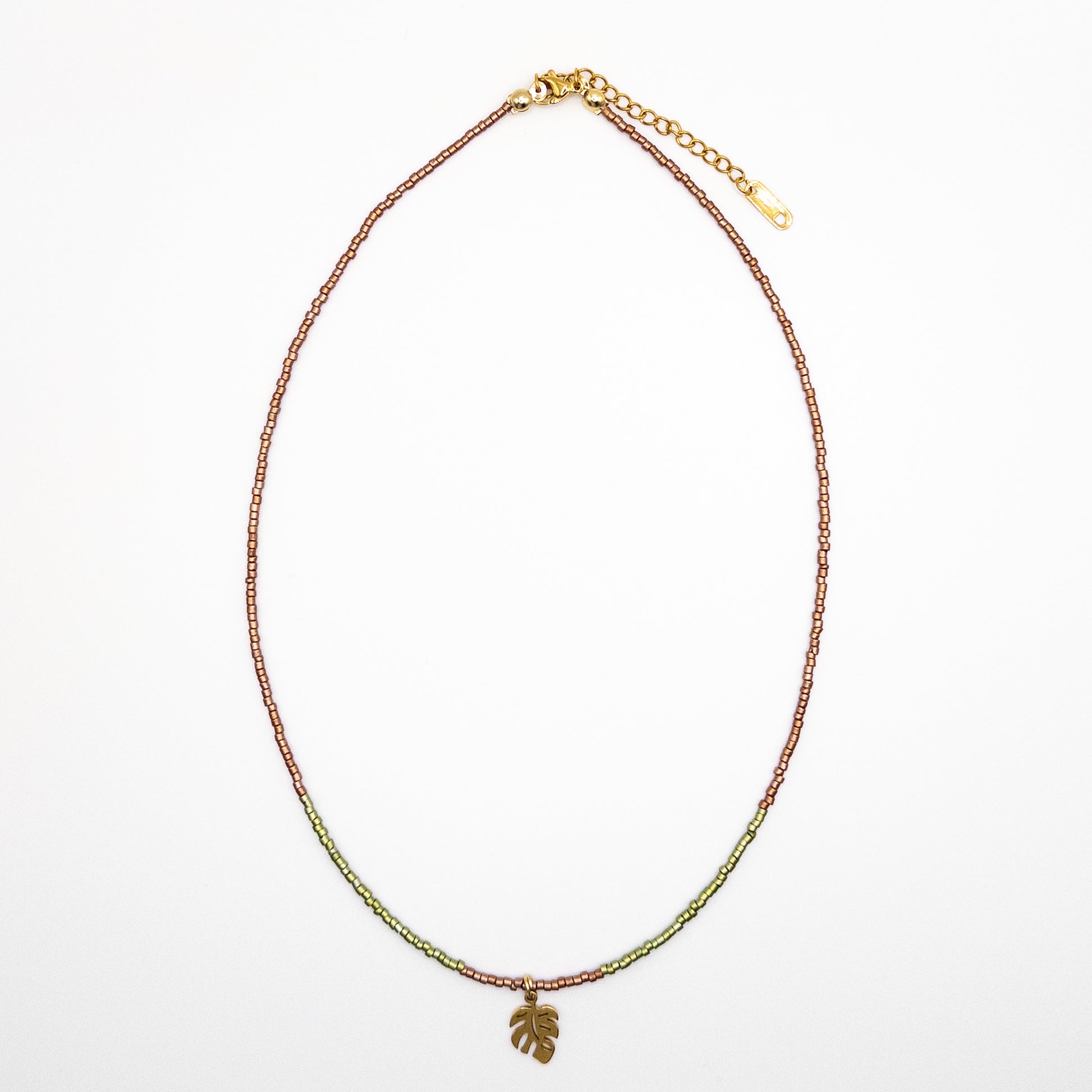 - Made of shiny brown and green beads with stainless steel leaf pendant!