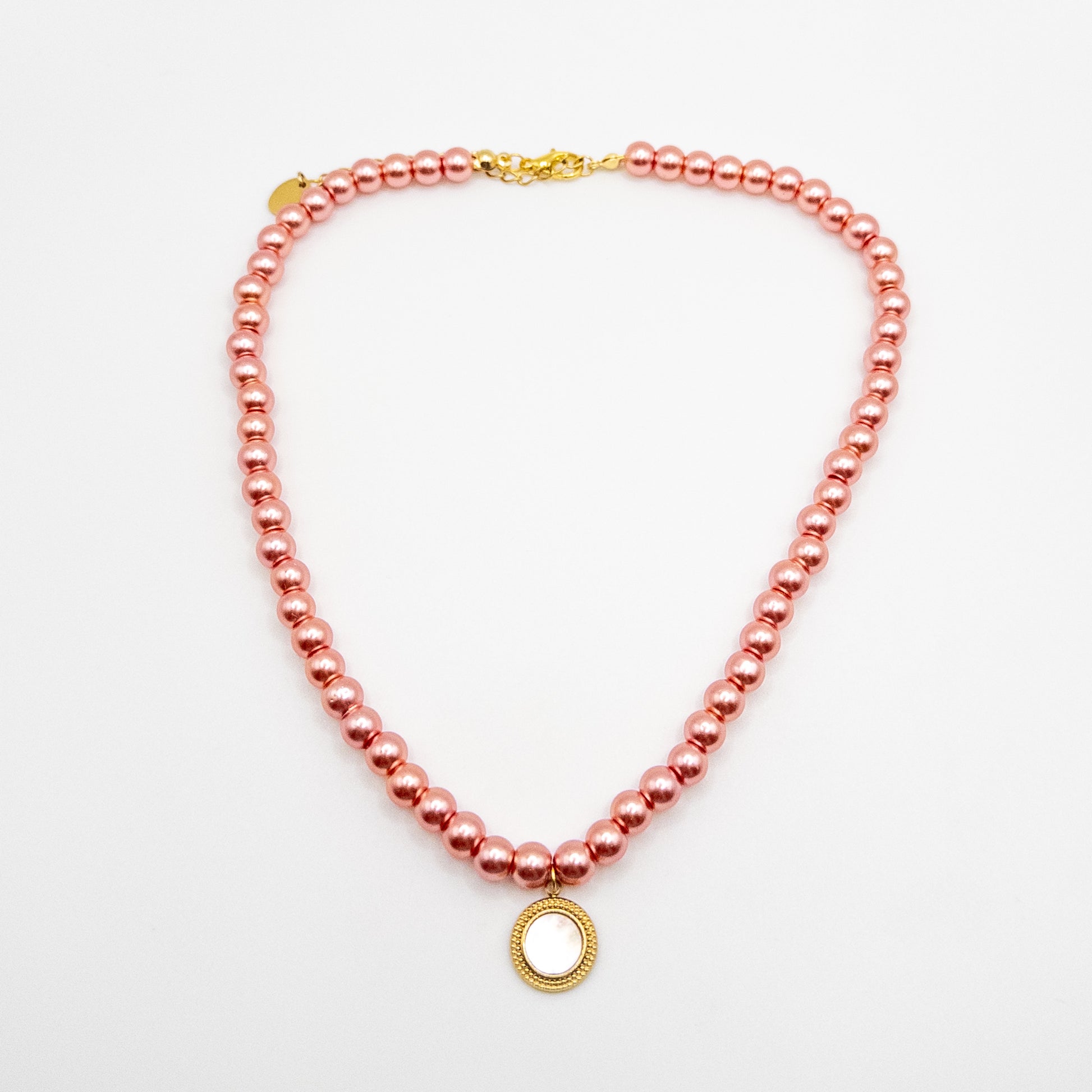 - Made of stainless steel pendant and pink color faux pearl beads.
